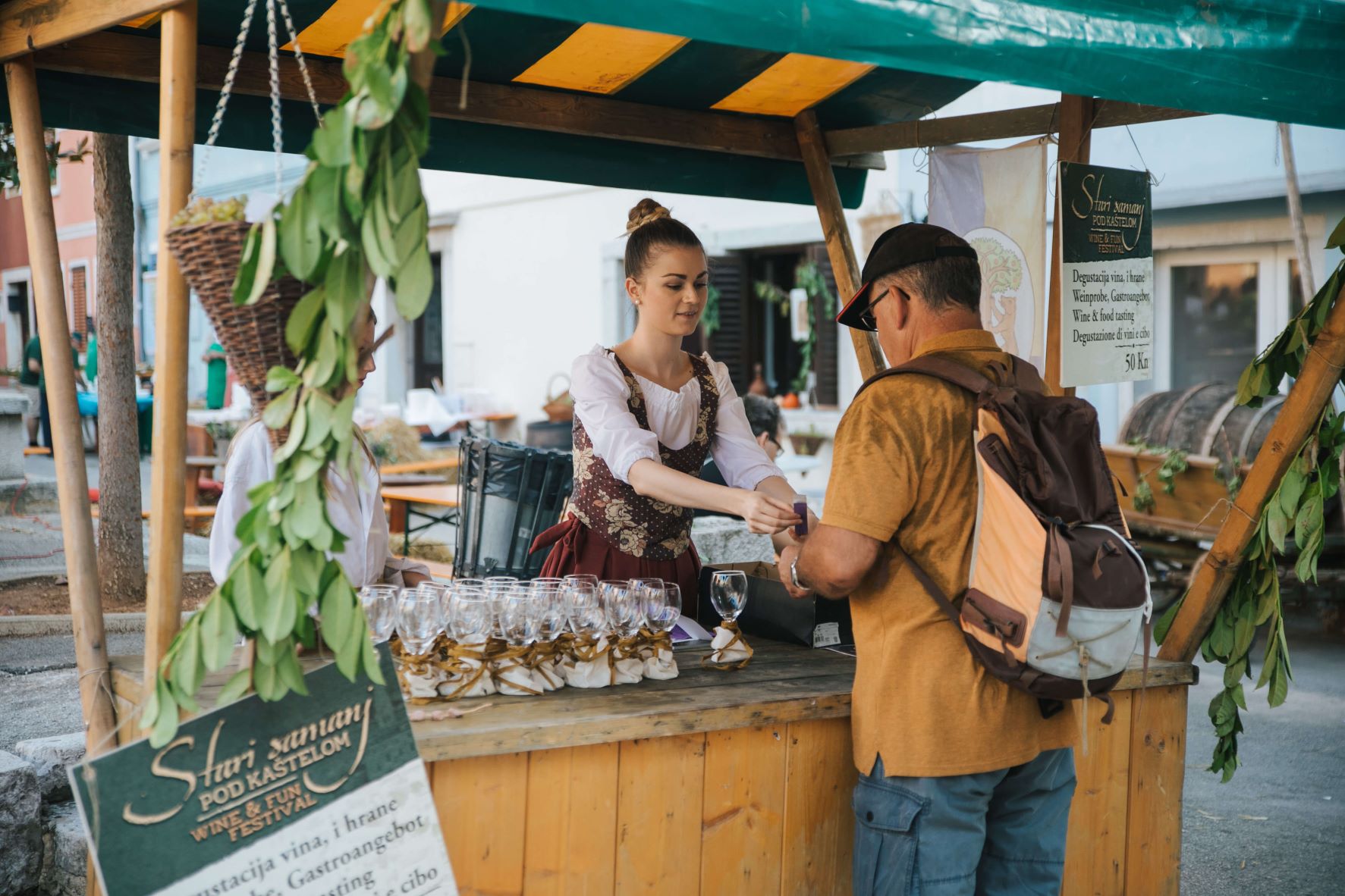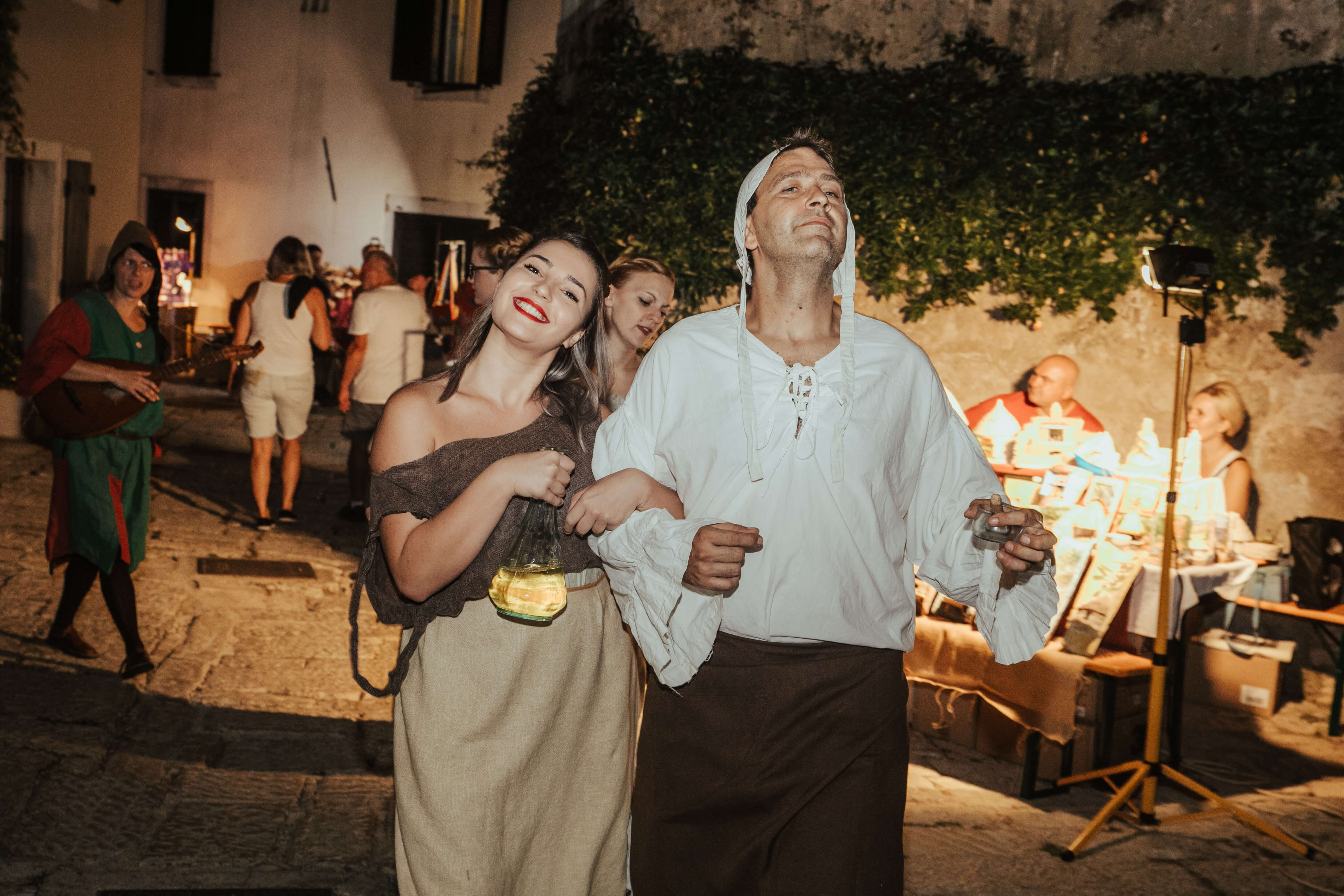 Kostümierte Wachen vor dem Stadttor begrüßen die Besucher und führen sie zum Platz, der die Atmosphäre der Zeit verkörpert, als der berühmte Abenteurer Giacomo Casanova Vrsar besuchte.Die Messestände bieten kleine Mahlzeiten, istrische geräucherten Schinken, Käse, Wein und hausgemachte Liköre, Honig und Honigprodukte, traditionelle trockene Kekse, kandierte Mandeln und süße Krapfen, sowie andere einheimische Produkte wie Souvenirs aus Stein und Holz.Die Moderatoren in mittelalterlichen Kostümen berichten kurz über die Geschichte von Vrsar, insbesondere über Kuriositäten aus dem Vrsar-Statut von 1609.Das Statut definierte die damaligen Lebensregeln in Vrsar, wie zum Beispiel die Arbeitsweise der Tavernen, die Kontrolle der Weinqualität, die Öffnungs- und Schließzeiten der Stadttore, die Kontrolle der Ausländer, die in die Stadt einreisten, Hygiene und Gemeindeordnung usw.Straßenkünstler und Musiker tragen zum fröhlichen und angenehmen Ambiente der Veranstaltung bei.