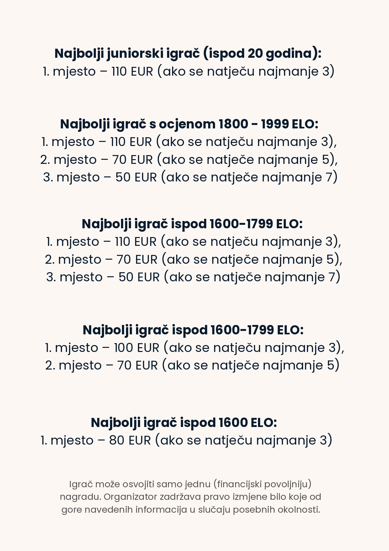 Turnir se rejtingira za standardni FIDE rejting, pružajući sudionicima priliku za osvajanje vrijednih bodova i natjecanje na visokoj razini.