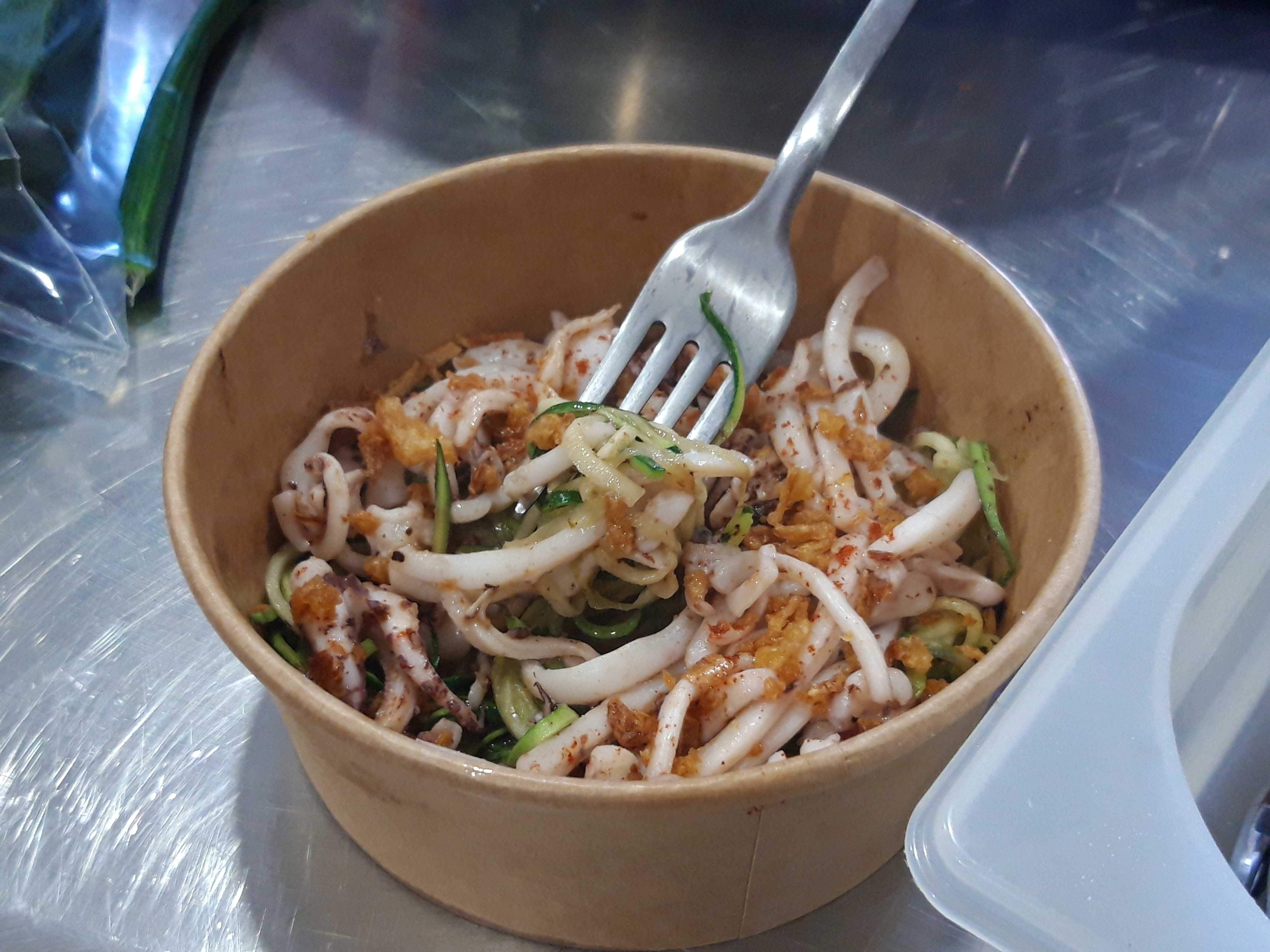 Clean the squid and cut into narrow strips. Cut the squid strips width-way, because if you cut lengthwise, they will curl and ill not look like spaghetti. After cutting, leave the squid to drain. Cut the courgette into thin strips i.e. julienne (best just the outer side with skin on it).